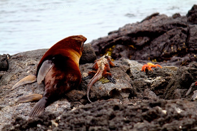 A Fur Seal, An Iguana and a Sally Lightfoot Crab are sitting on a rock …