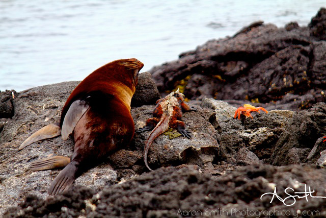 A Fur Seal, A Marine Iguana and a Sally LIghtfoot Crab are sitting on a rock…